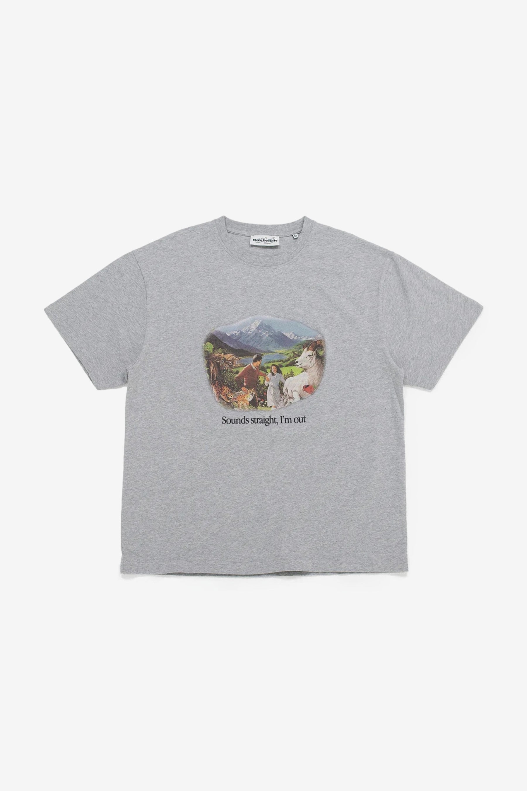 The Carne Bollente Sounds Straight, I’m Out T-shirt in Melange Gey. That's ying to the now famous Sounds Gay I am in t-shirt. Again made from organic cotton jersey and finished with a rib-knit crewneck and front graphic print.
