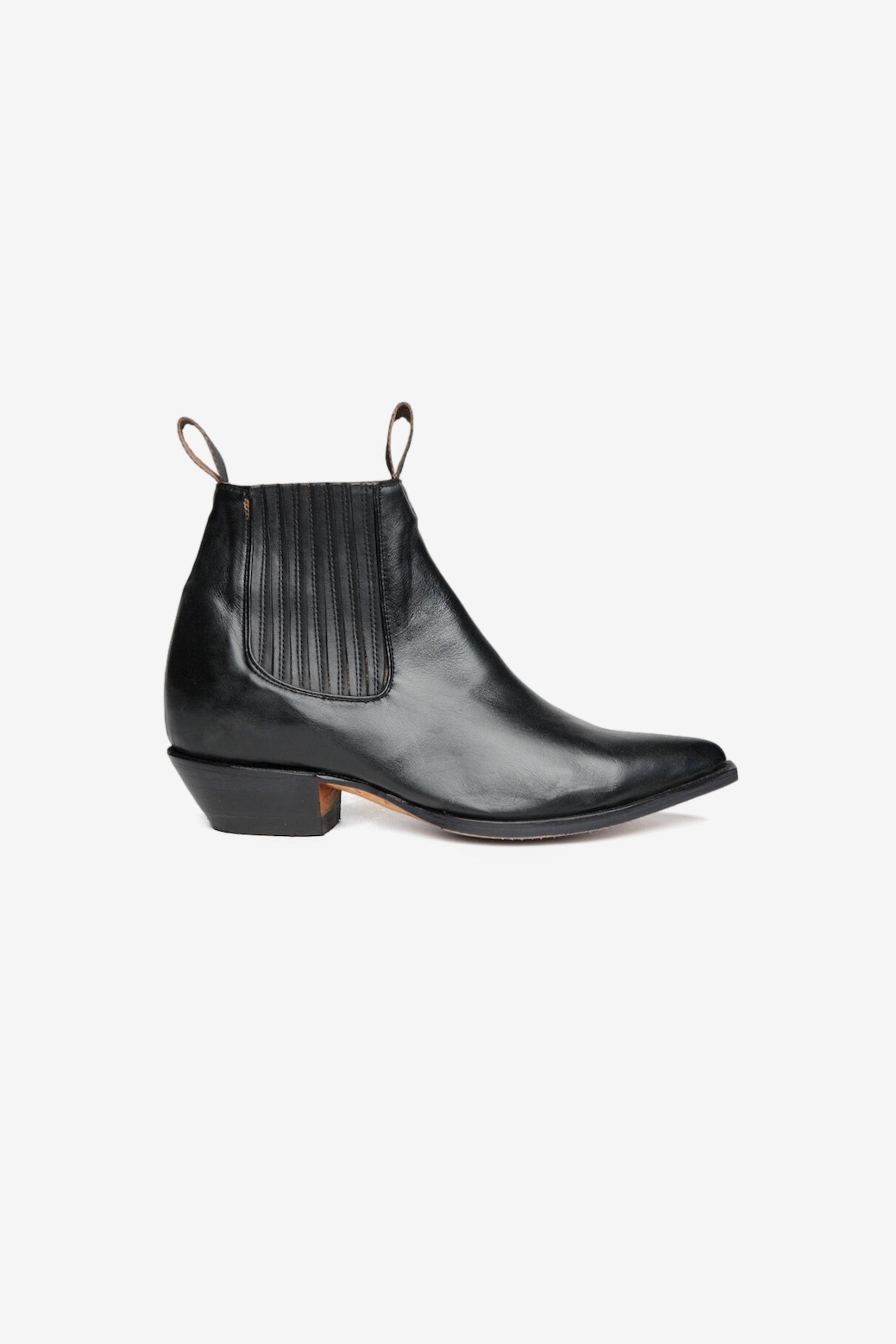 The Botin is a western Chelsea-style boot featuring a pointed toe, handmade from a cow leather upper with leather lining and soles. Designed for both style and comfort, it boasts a combination of leather and rubber heels, along with leather insoles. The boots are equipped with elastic bands on the sides and pull tabs at the top for easy wear. Handcrafted in Mexico, they feature an angled heel measuring 1 inch (2.5 cm).
