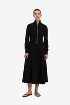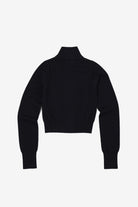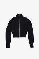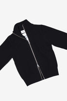 Fitted zip-up cardigan with extra long sleeves and a high collar. Rib knitted at the cuffs, neck and hem.