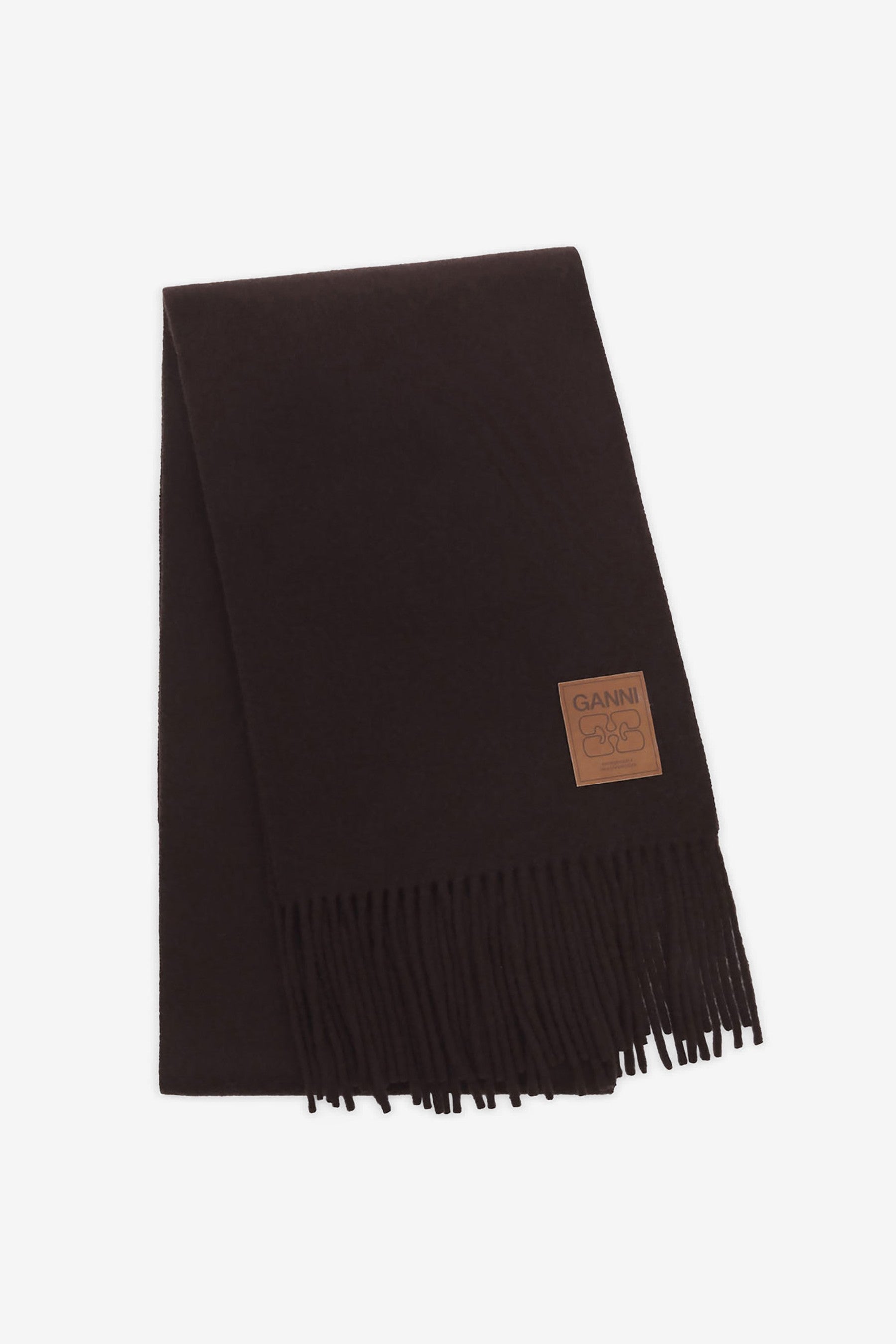 In Chocolate Plum, Ganni's Double Face Wool Knit Scarf is crafted from 100% wool and finished with fringe edges. A logo patch completes the design. Made from 100% wool.