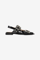 You are looking at the Feminine Buckle Ballerina Patent Croco in Black by Ganni.