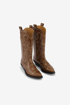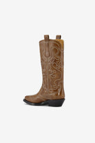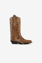 You are looking at the Mid Shaft Embroidered Western Boot in Tiger's Eye by Ganni.
