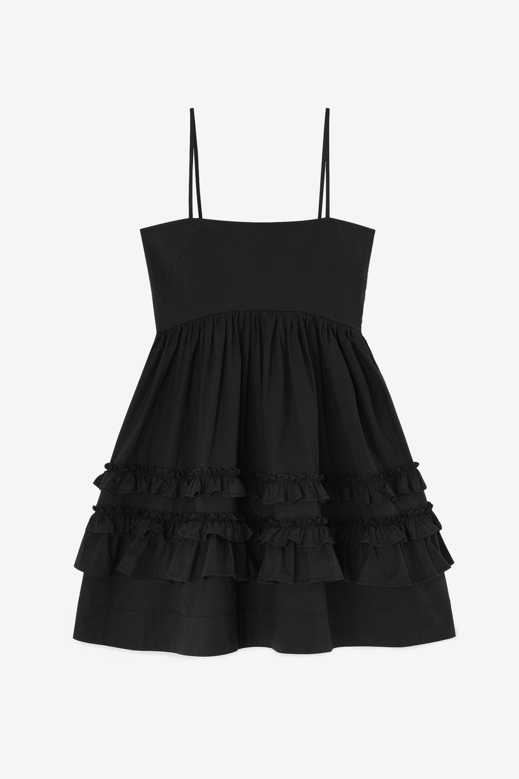 Ganni's Stretch Cotton Mini Strap Dress With Frills in Black is a clean mini silhouette with a straight neckline and spaghetti straps. Side pockets and frill detailing add subtle texture, finished in a stretch organic cotton blend. Made from 97% organic cotton, 3% elastane.