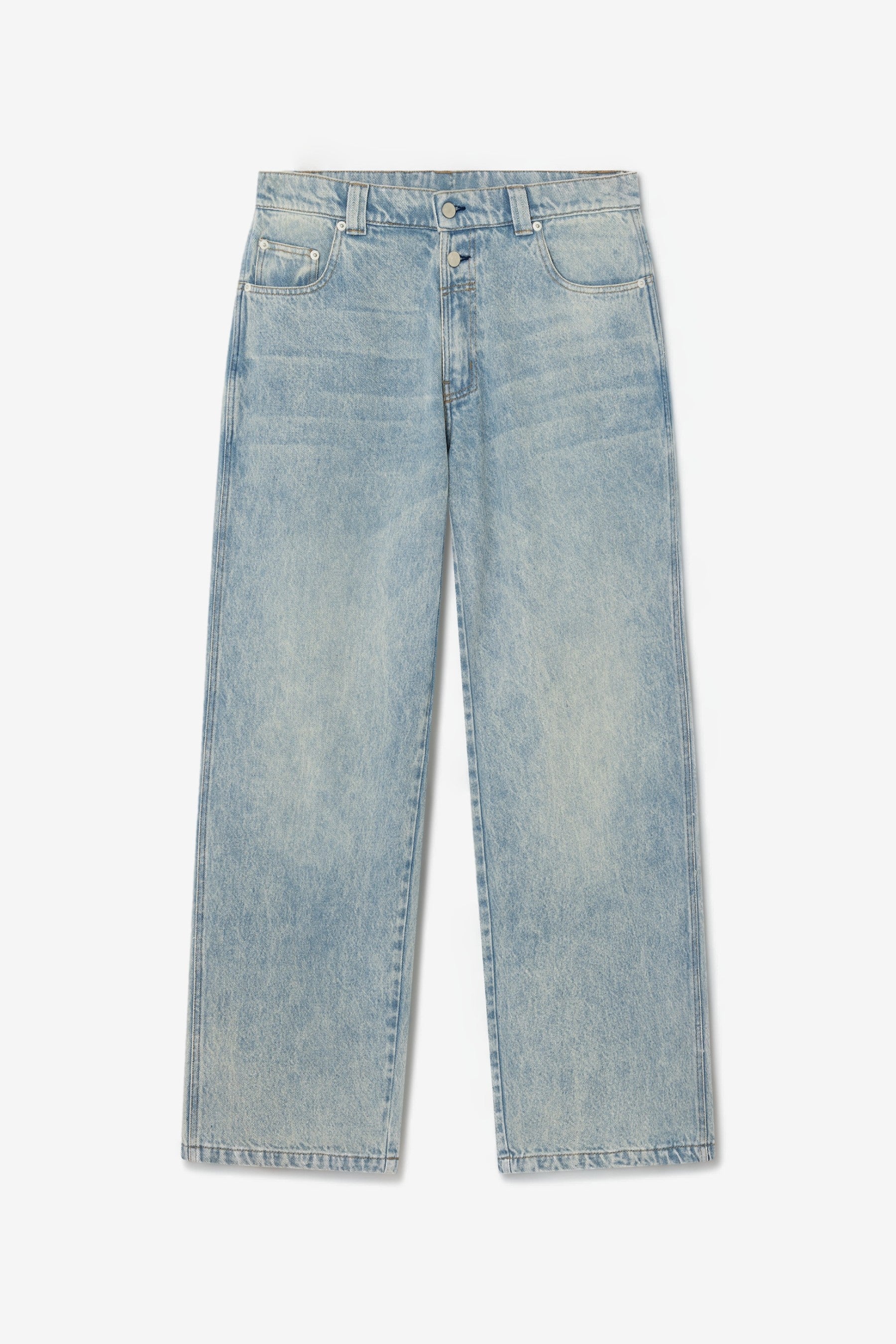 Gimaguas Baggy Trousers in Washed Blue. Wide-leg, full-length denim trousers with a low-rise waist and relaxed fit.