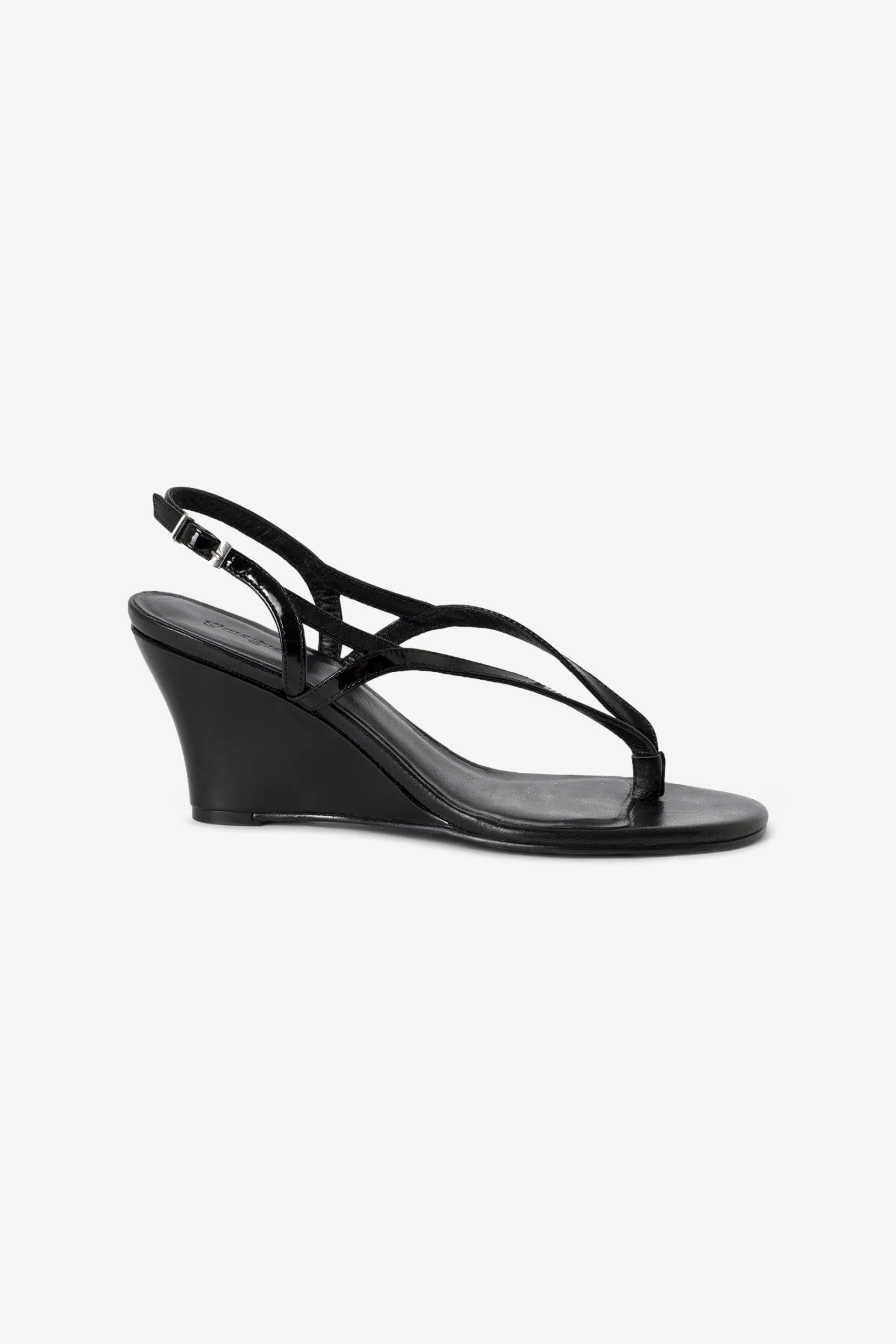 Gimaguas Sandal Wedges in Black. Glossy patent-leather wedge sandals with minimalist straps at the toes and ankle and a 7.5 cm heel.