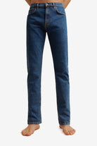 A mid-waist jean featuring a loose thigh and tapered leg from the knee.