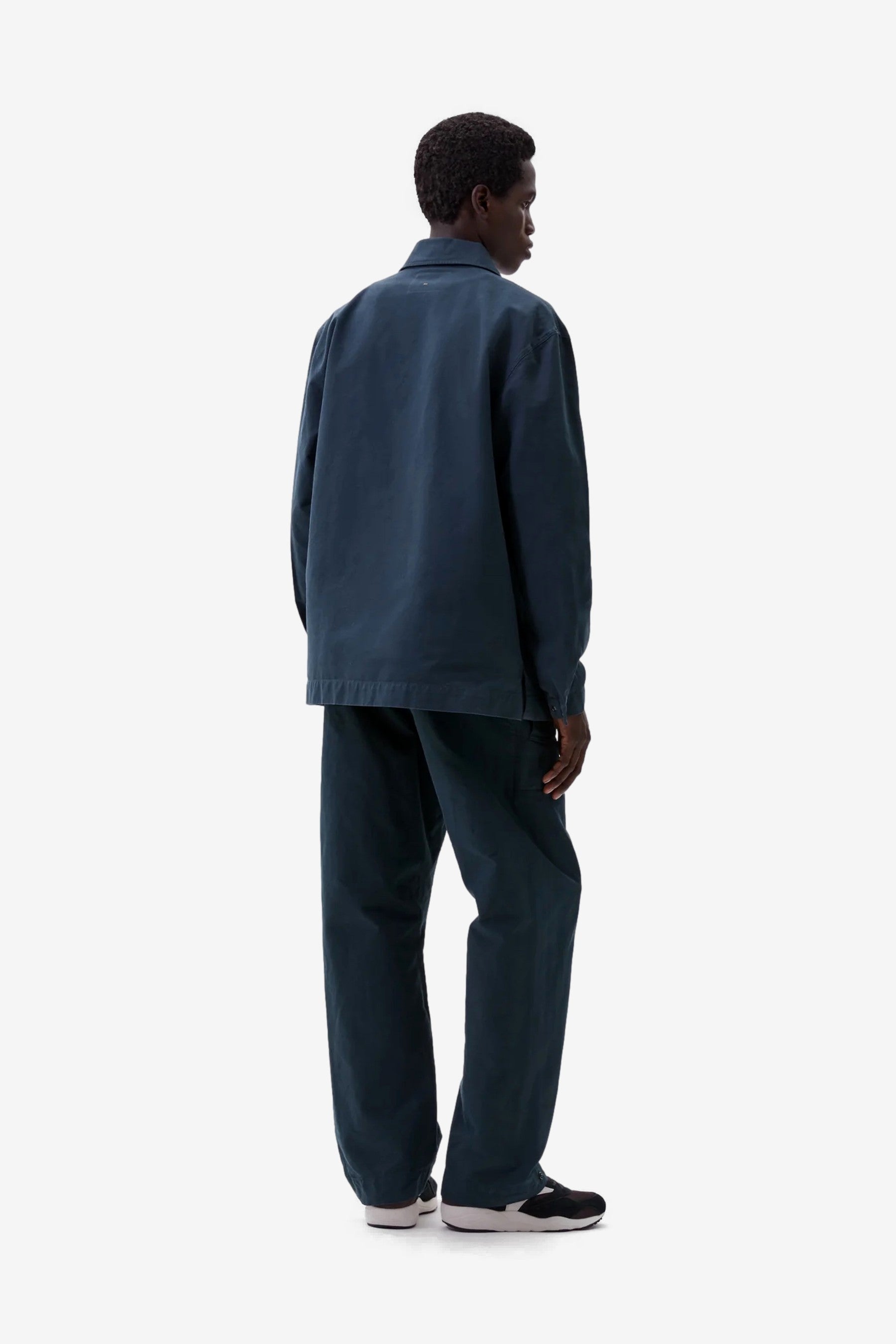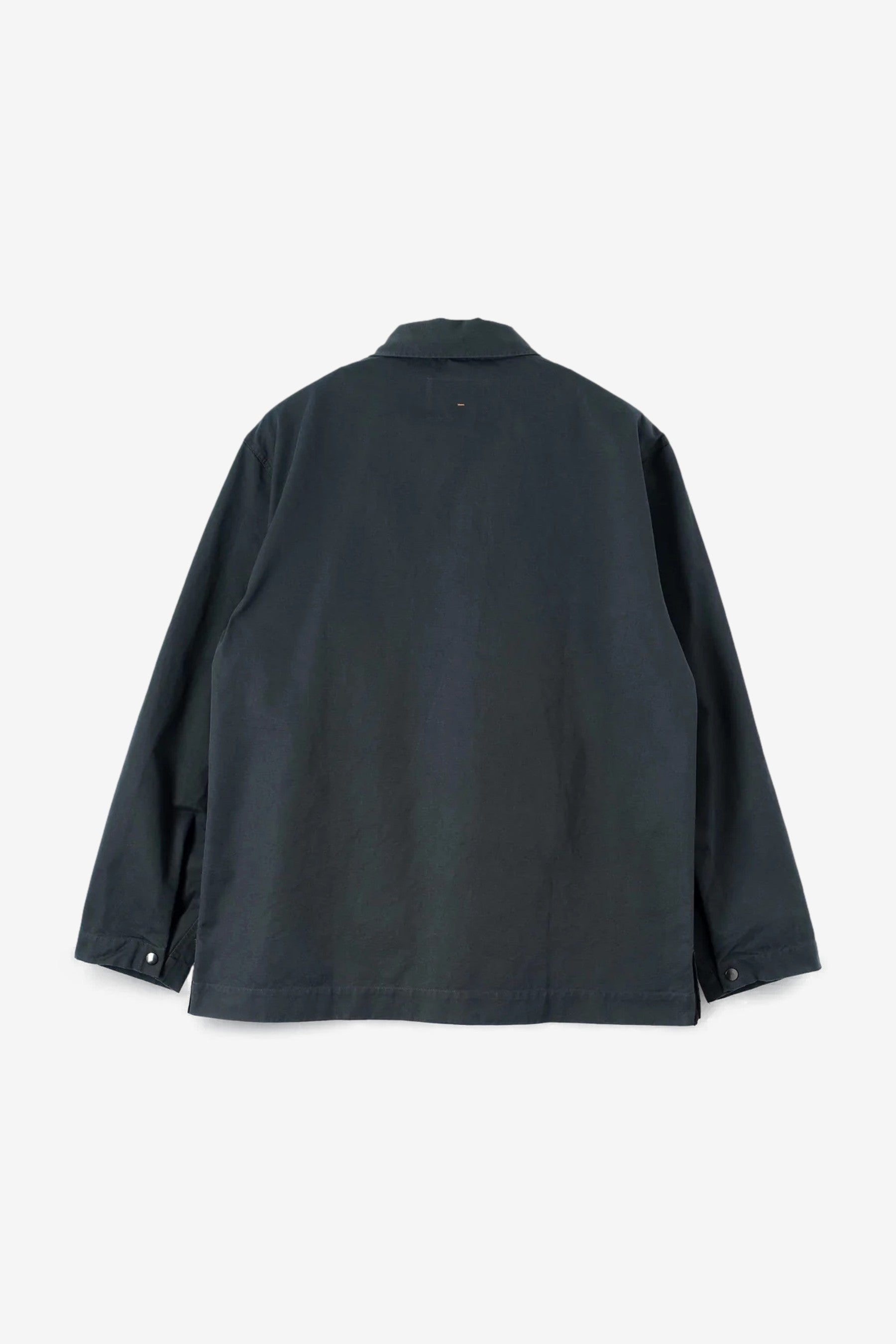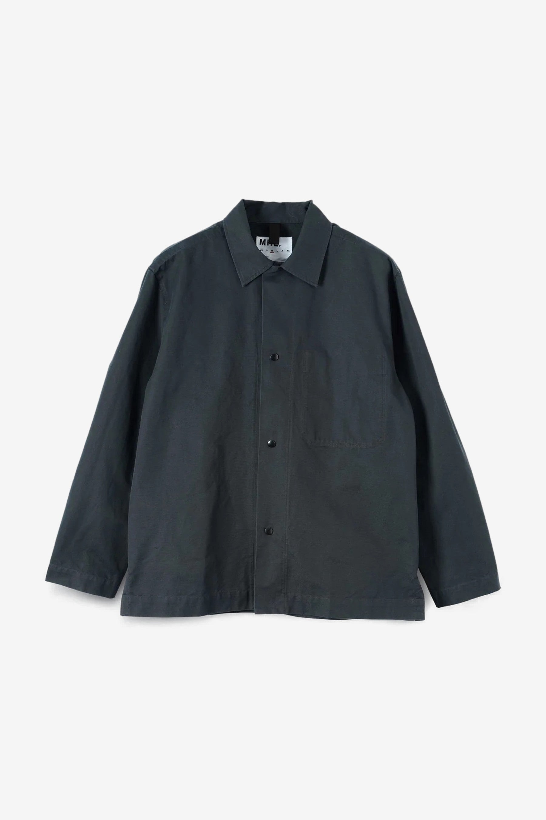 MHL Chore Shirt in Petrol is a relaxed overshirt cut in dense cotton canvas with a soft hand. Finished with press‑stud front, stitch‑through chest pocket, button‑adjustable cuffs and a split hem with herringbone tape detail.