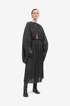 This pleated skirt in dark grey melange and ivory offers a refined and minimalist aesthetic, perfect for any wardrobe. Its architectural design features a raw edge and hem, complemented by an elasticated waist for comfort and style.