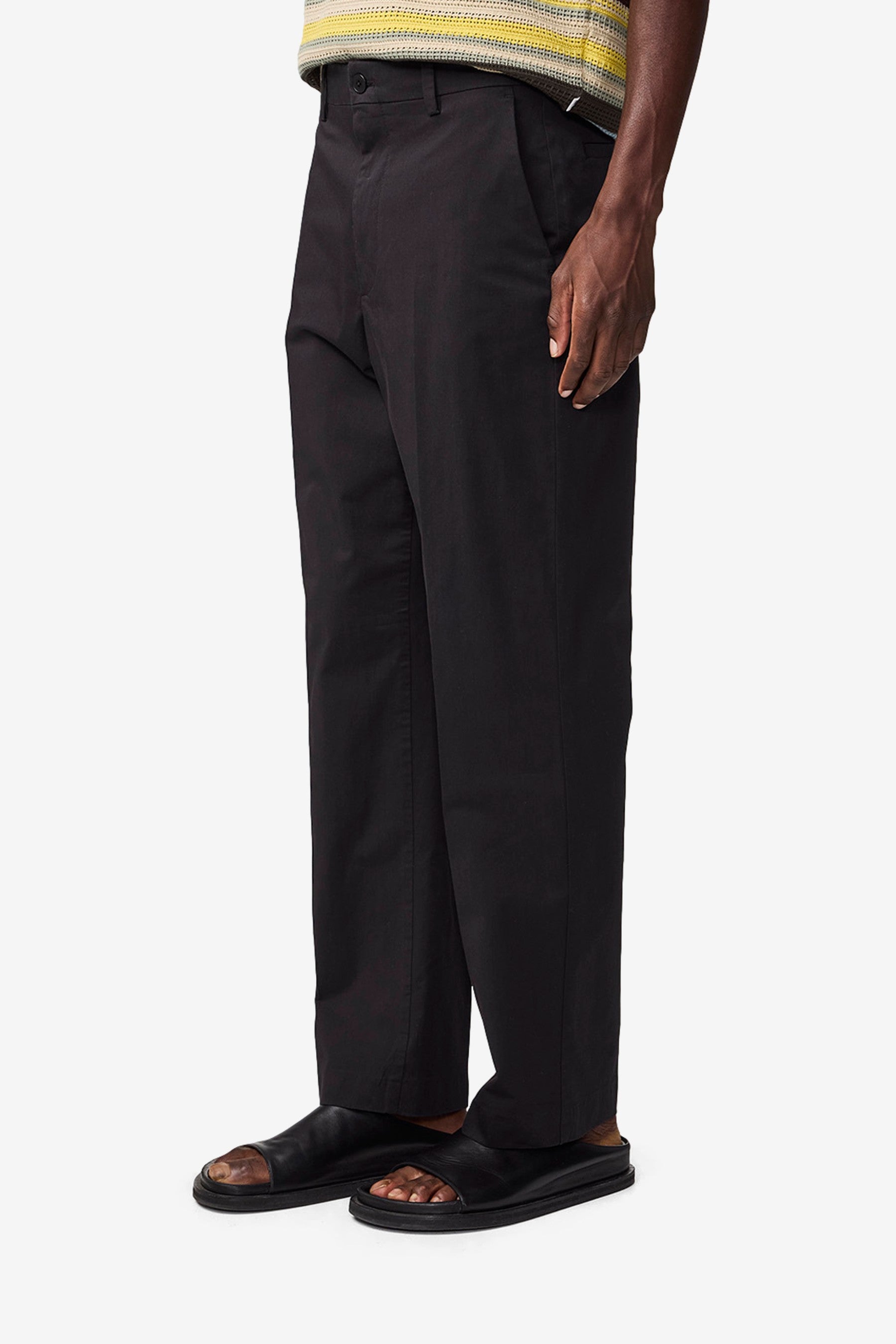 A pair of relaxed, straight-leg trousers crafted in a soft satin 220 g/m2 organic cotton and TENCEL™ lyocell blend with a touch of stretch. Tailored with slanted side pockets and dual back welt pockets.