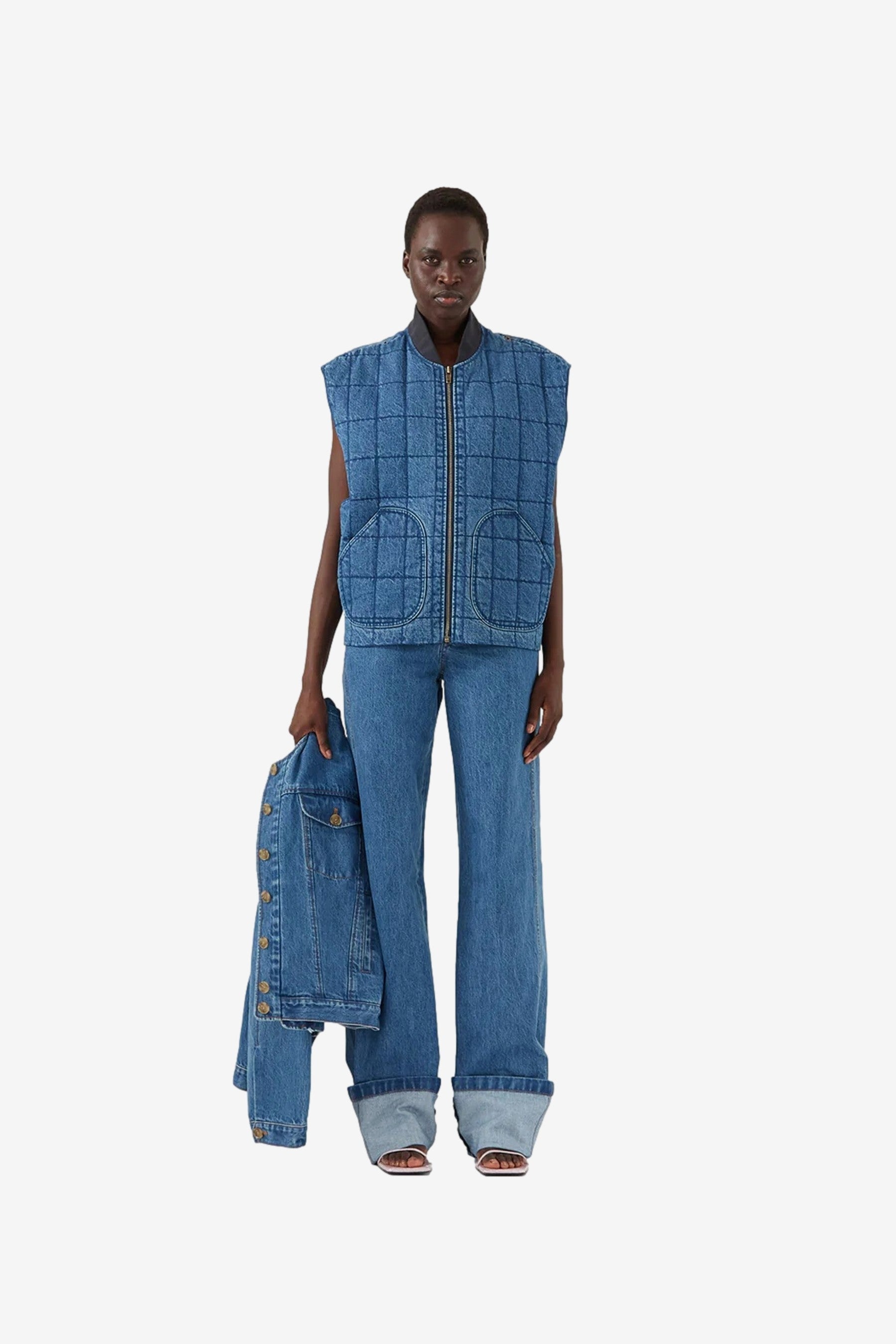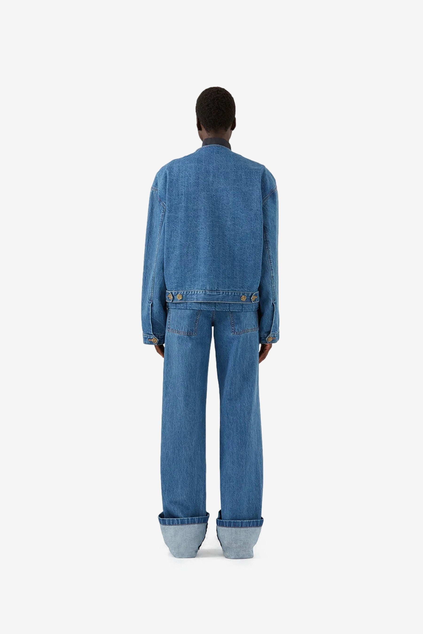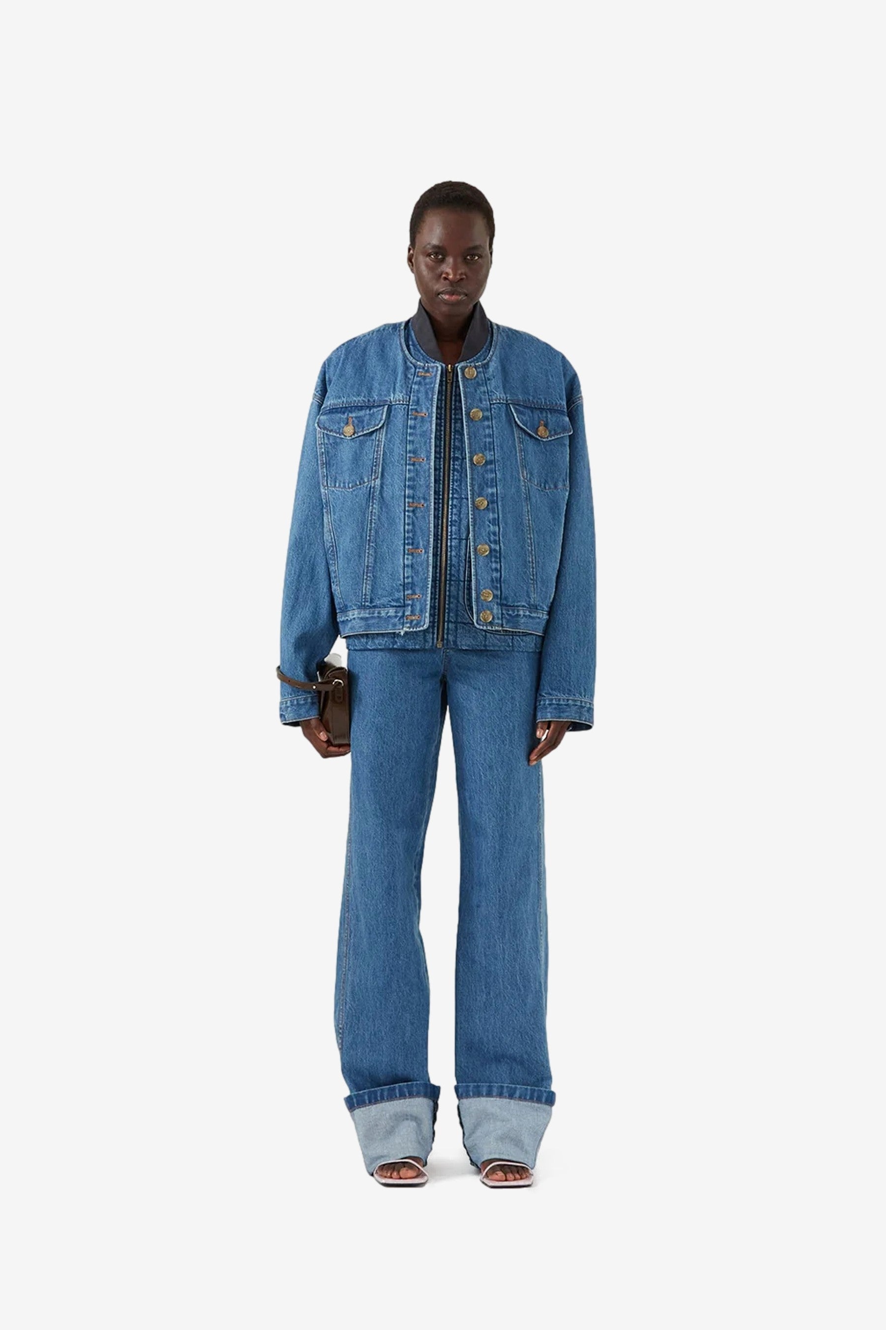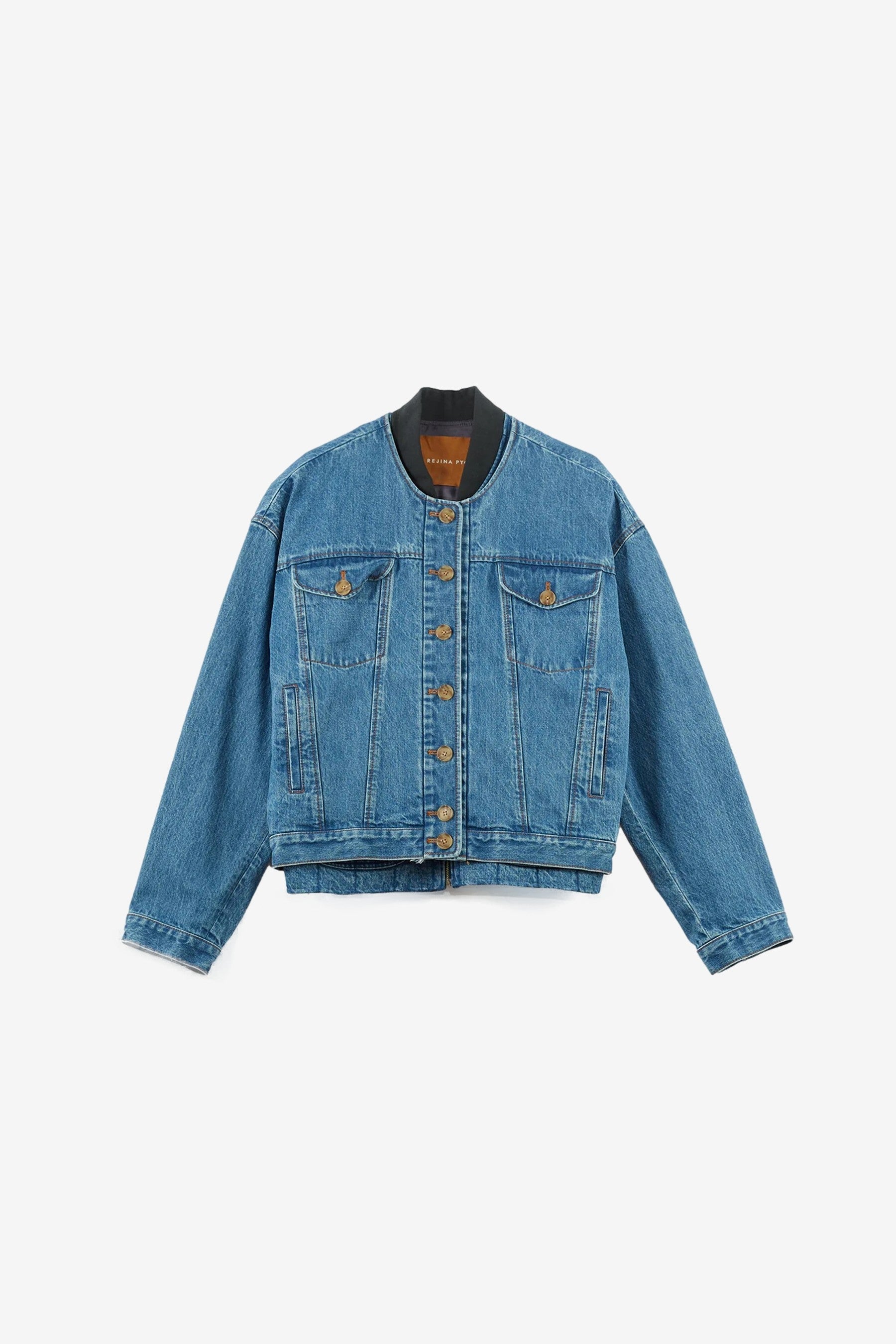 You are looking at the Wells Bomber Jacket in Organic Cotton Denim Blue by Rejina Pyo.