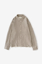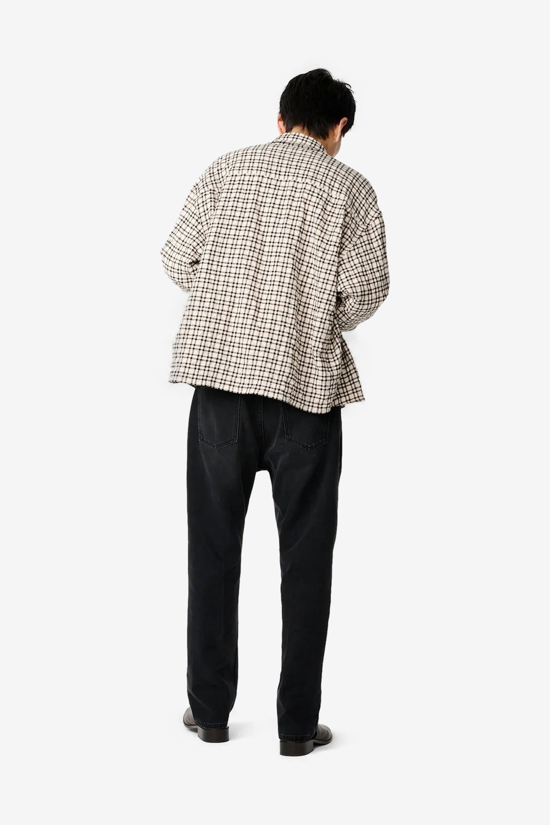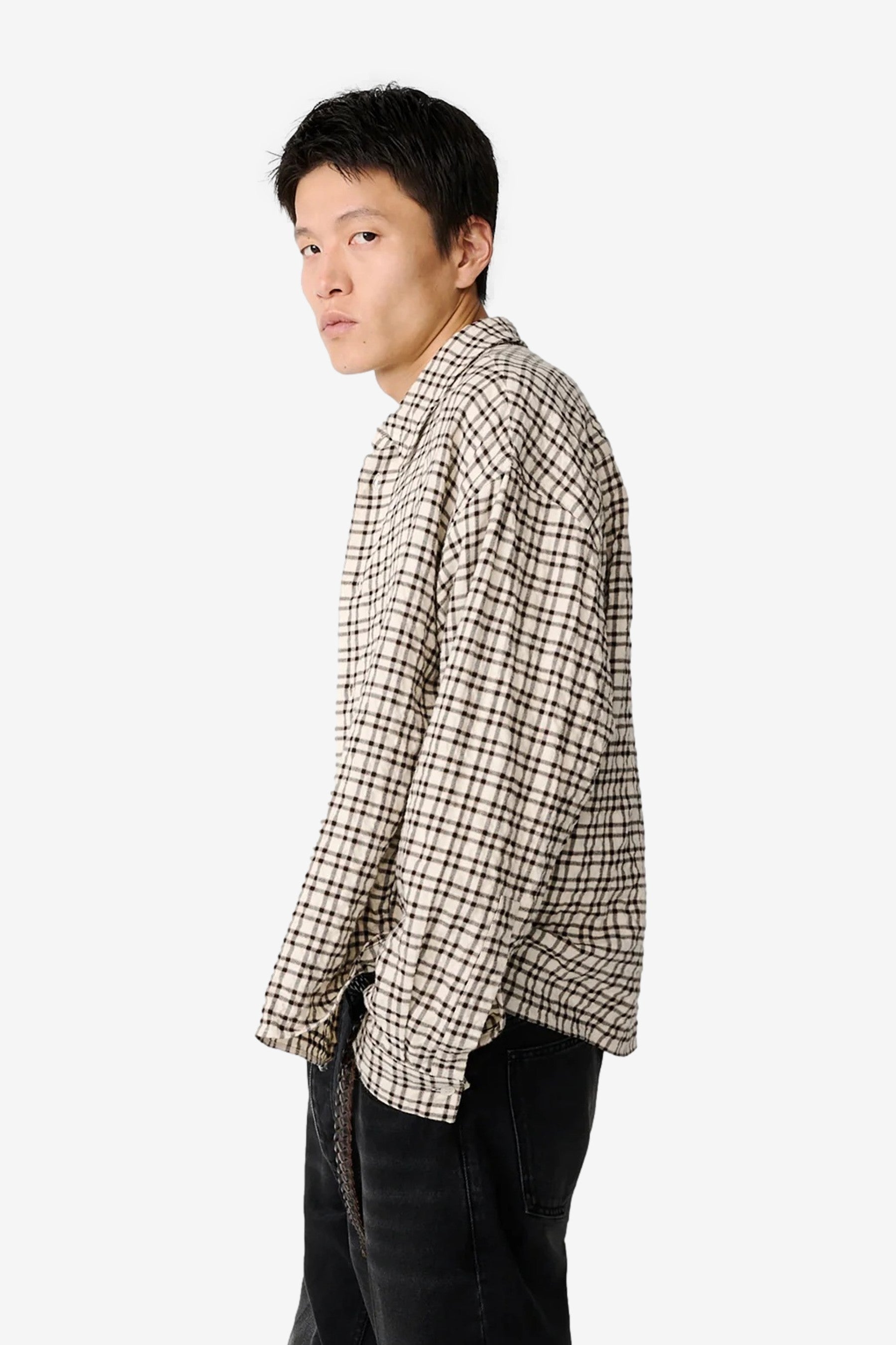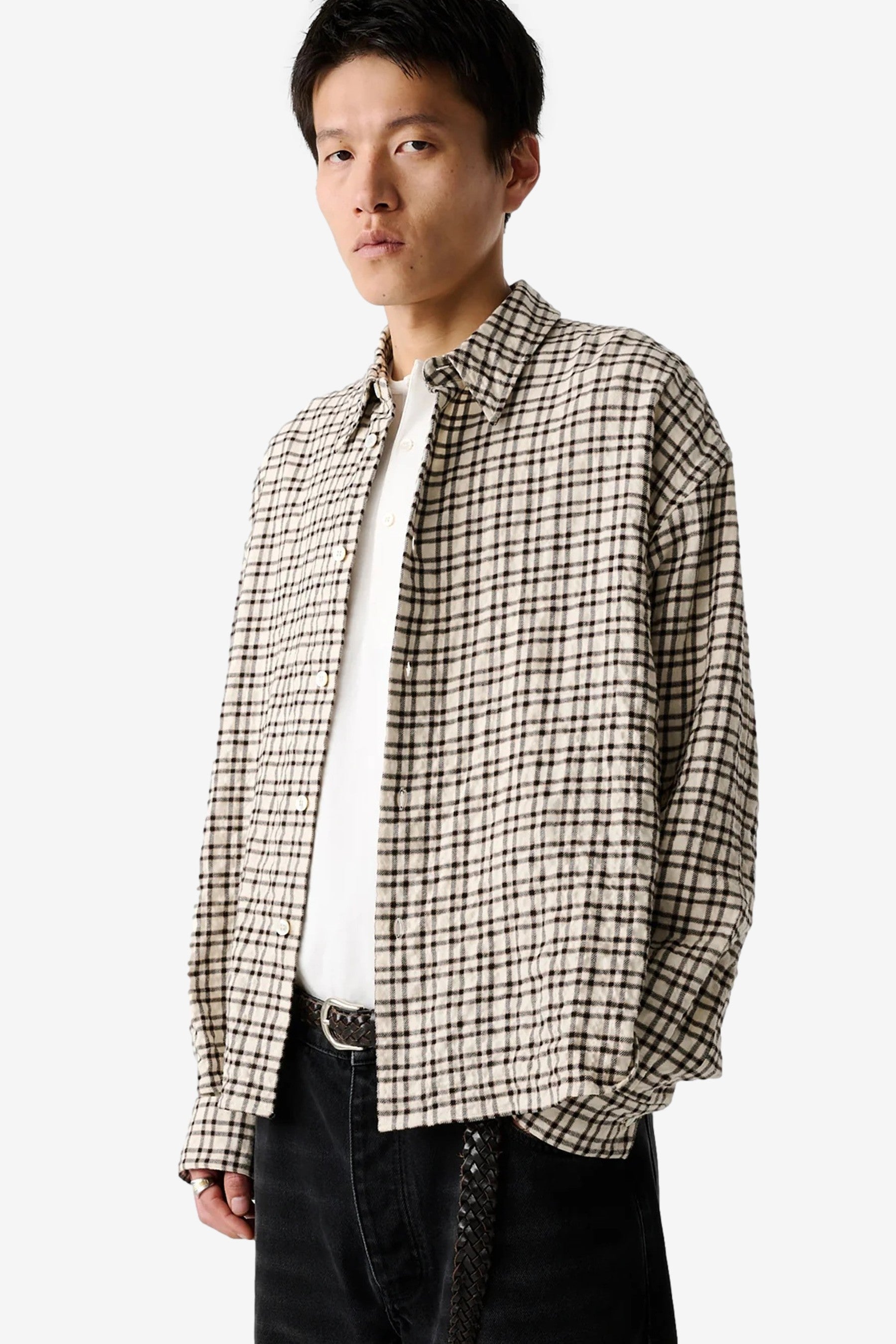 Studio Nicholson Nostra in Canvas / Black Check. A fabric-forward shirt cut in a brushed wool-linen blend, shaped to a generous, slightly boxy fit with a sharp point collar for easy, laid-back layering.