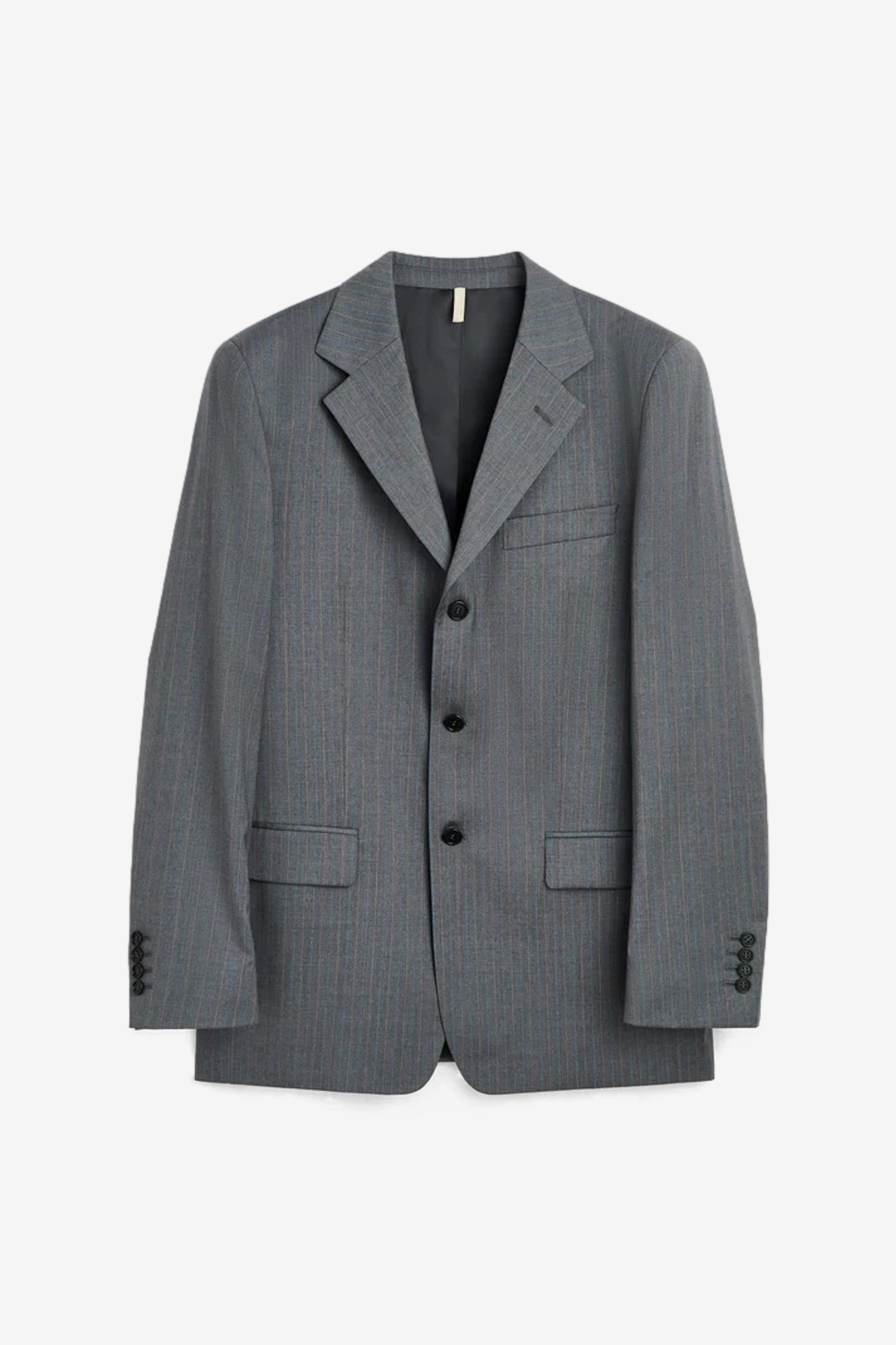 The Show Blazer in Grey Melange Stripe by Sunflower. This single-breasted jacket is built around an easy, casual fit and finished with a three-button front, horn-style buttons and a smooth lining for effortless layering.