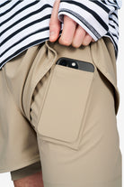 Unisex running shorts in Warm Sand, featuring an inner lining and side vents. The 3-inch Flow Shorts offer a soft stretch and are made from ECONYL®. Podium Logo on the front and a reflective "Finish in a Good Place" slogan on the back. Includes one pocket in the inner lining and a hidden pocket at the back. Also available in a 5-inch length.