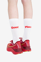 2-pack of longer running socks with slight compression and a check composition. Red jacquard embroidery UNNA logo on the toe and 'Good Place' with one word separated on each sock.