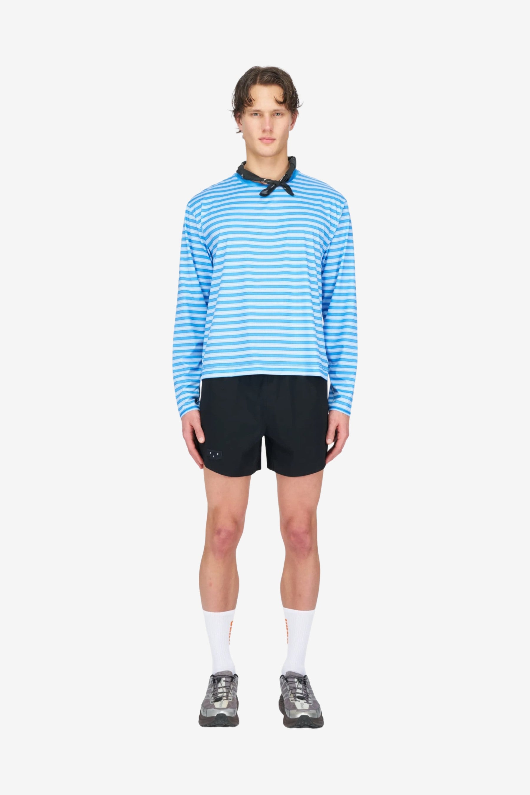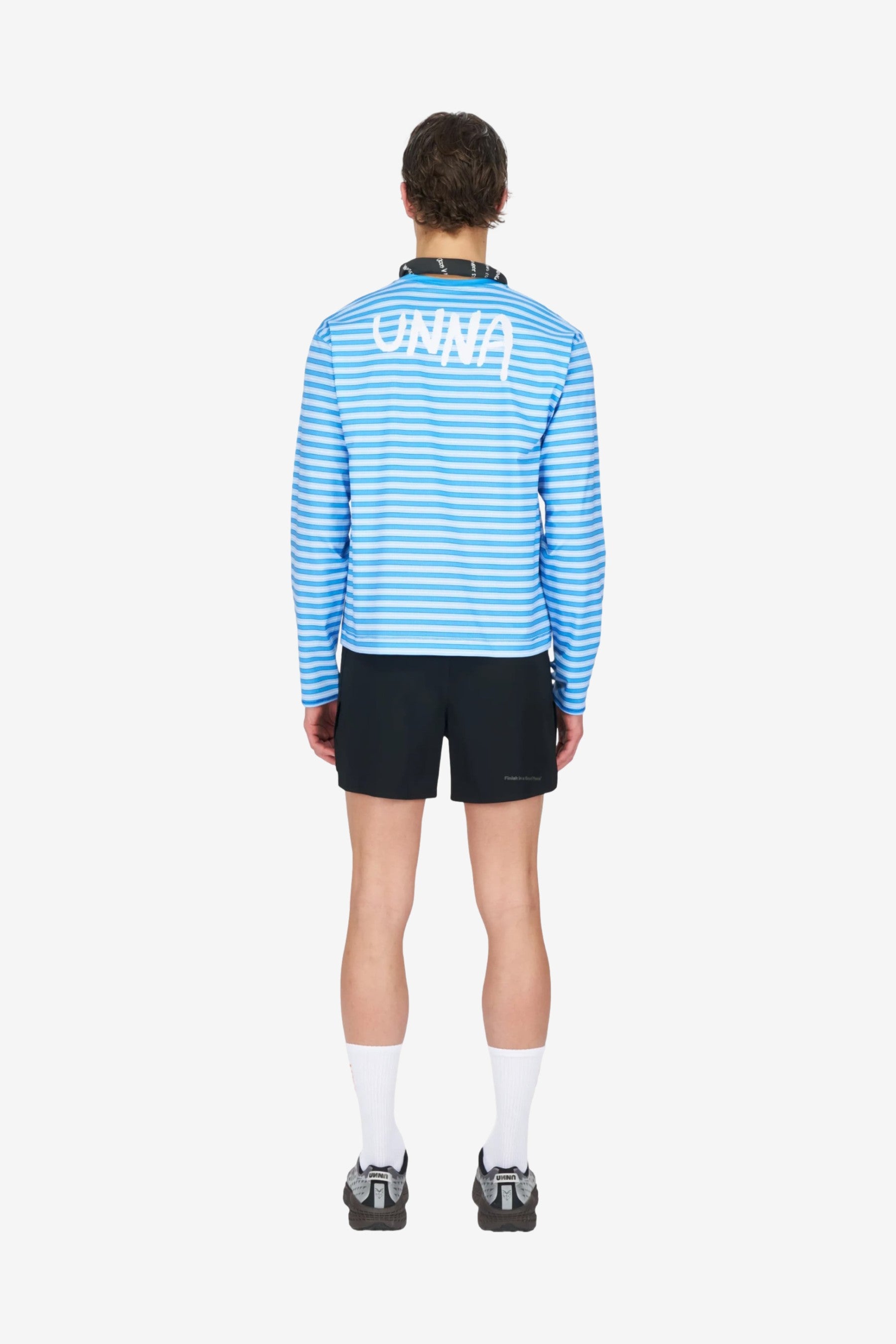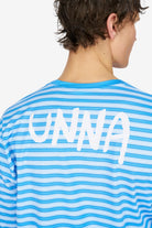 UNNA's Striped LS in Business Blue brings together technical function and a distinct graphic finish. This men's long-sleeve running T-shirt is made from quick-drying recycled polyester with 4-way stretch, and features a water-based striped print, perforations for breathability, thumbholes, and a bold UNNA graphic on the back.