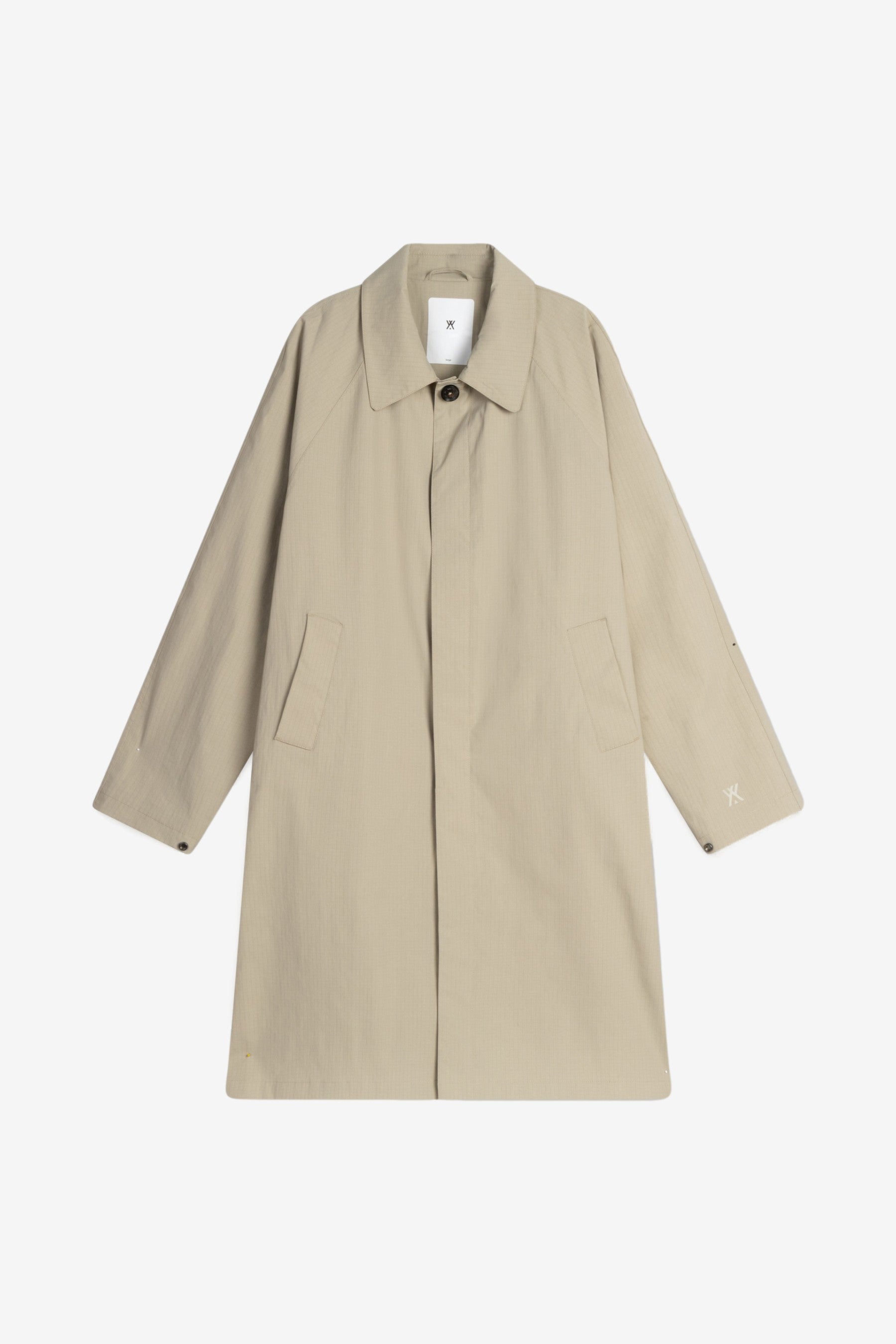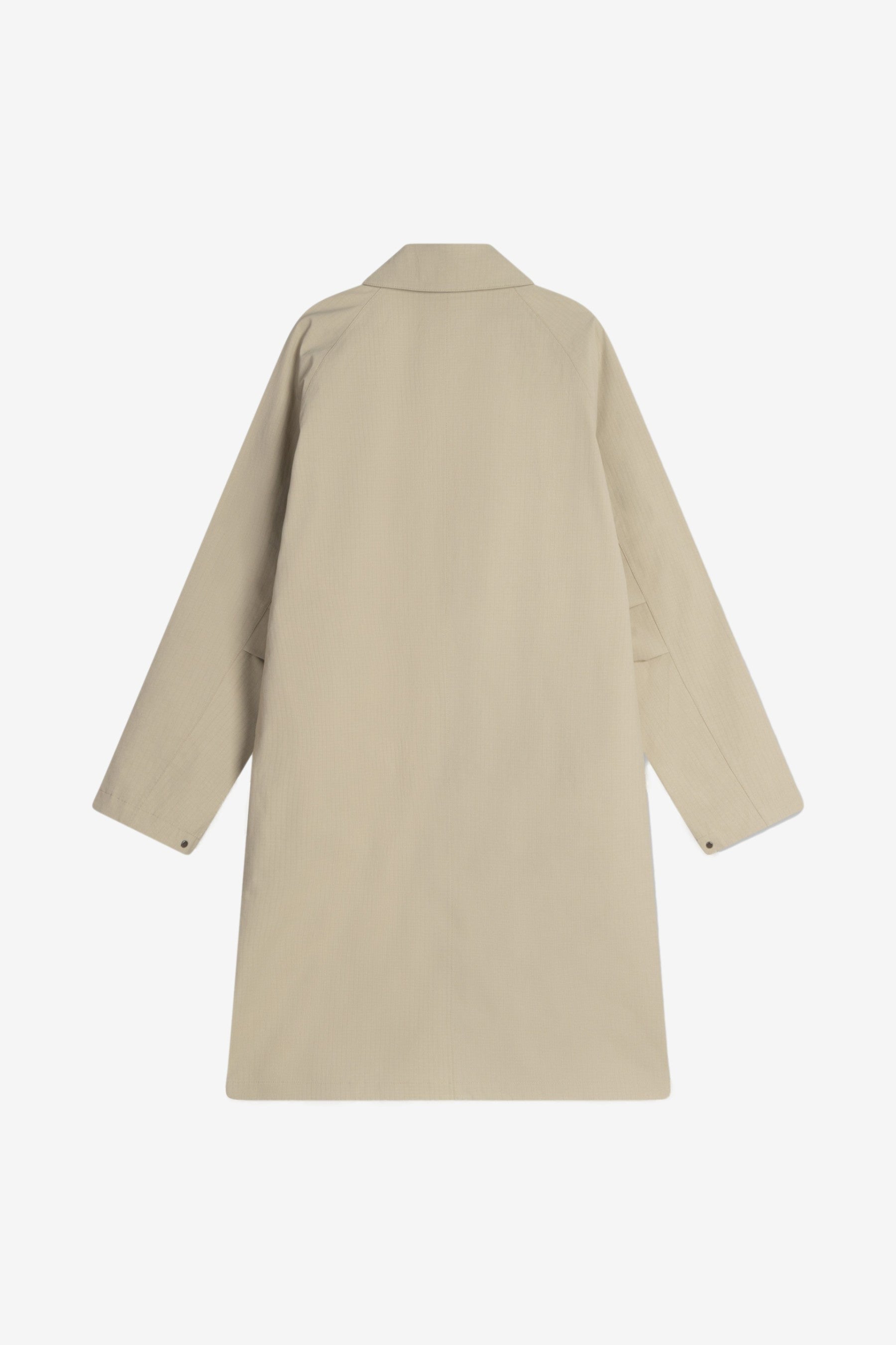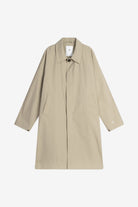 Welter Shelter Joba Carcoat B Ripstop in Beige. A modern, trench-inspired car coat with a generous oversized silhouette and dropped shoulders for easy layering.